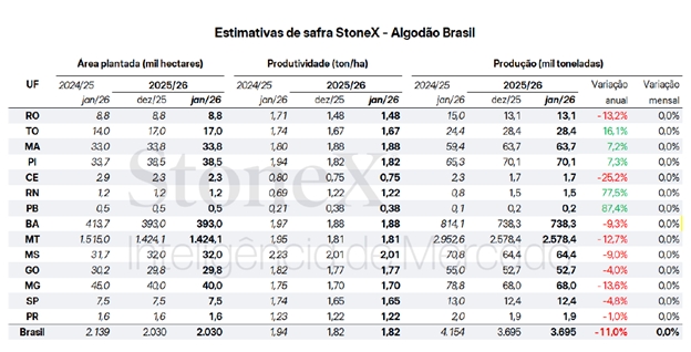 A estimativa para a produção brasileira de algodão em janeiro permanece em 3,7 milhões de toneladas, mantendo o mesmo volume projetado no relatório de dezembro da StoneX, empresa global de serviços financeiros. Apesar da estabilidade mensal, o número representa uma queda de 11% em comparação à safra 2024/25.